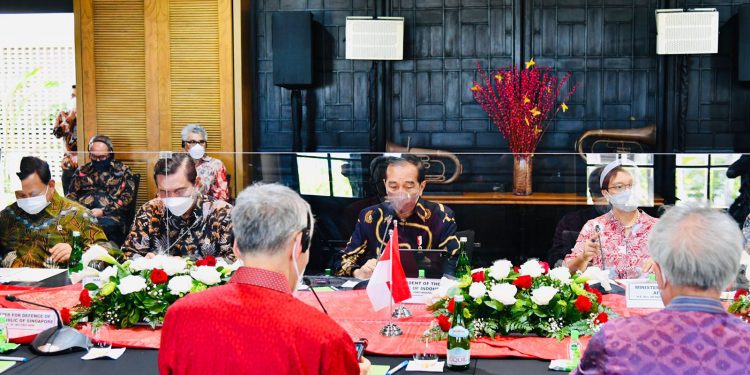 BINTAN | Presiden Joko Widodo dan Perdana Menteri (PM) Singapura, Lee Hsien Loong, menggelar pertemuan bilateral di Ruang Dahlia, The Sanchaya Resort Bintan, Kabupaten Bintan, Kepulauan Riau, Selasa 25 Januari 2022. Dalam sambutannya, Presiden Joko Widodo meyakini hubungan Indonesia-Singapura akan makin kuat.