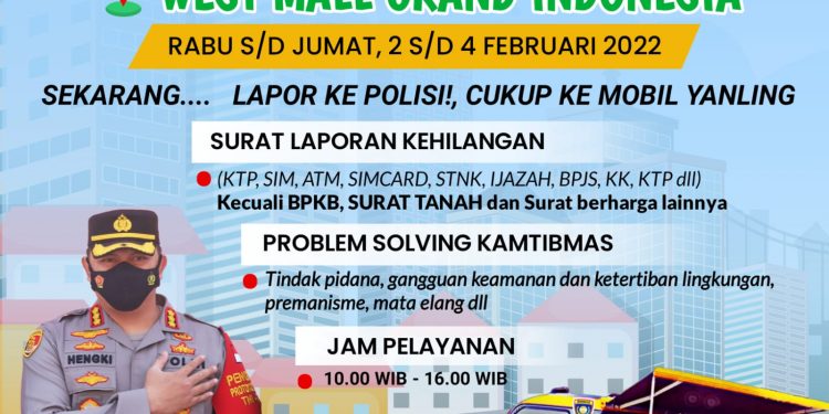 JAKARTA PUSAT |Polres Metro Jakarta Pusat menggelar pelayanan masyarakat untuk membuat laporan dengan mobil keliling (Yanling) di West Mall Grand Indonesia Tanah Abang Jakarta Pusat, Rabu (02/02/2022).