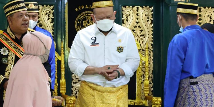 SEKADAU |Sebuah gelar kehormatan didapat Ketua DPD RI, AA LaNyalla Mahmud Mattalitti, saat berkunjung ke Kerajaan Kusuma Negara Sekadau, Kalimantan Barat, Jumat (29/10/2021). LaNyalla disematkan gelar kekerabatan, Pangeran Jaya Sukma Dilaga.