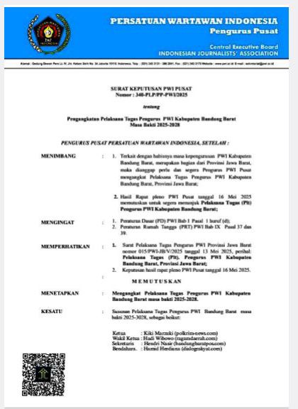 Dari hasil keterangan yang telah dihimpun dari beberapa narasumber media, bahwa PWI Kabupaten Bandung Barat sudah terbentuk dengan adanya pengangkatan Pelaksana Tugas Pengurus, terlampir dengan Surat Keputusan PWI Pusat Nomor : 340-PLP-/PP-PWI/2025, yaitu : Ketua : Kiki Marzuki ,