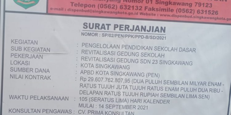 Kota Singkawang | Pemerintah kota Singkawang telah merealisasikan Anggaran APBD Tahun 2021 Sebesar Rp. 29.762.807.95 Milliar Sumber Dana (PEN) Program Pemulihan Ekonomi Nasional,”Yang mana digunakan untuk Proyek peningkatan Pendidikan Sekolah Dasar (Revitalisasi Gedung SDN 23 Singkawang)* Berlokasi di kota Singkawang Sarana dan Prasarana Sekolah. Tanggal 29/1/2022.