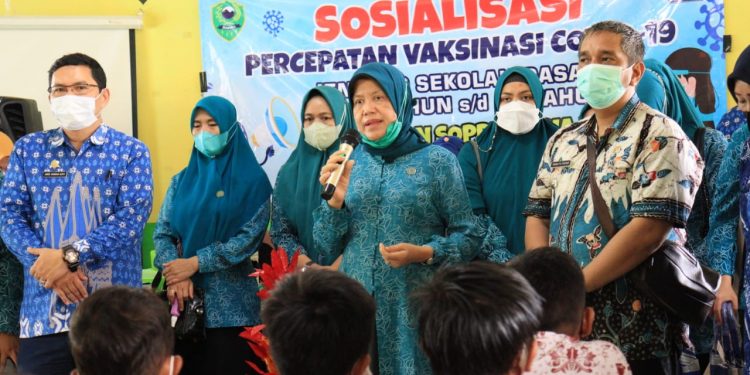 BARRU | Vaksinasi Covid-19 untuk anak-anak menjadi perhatian Bunda Paud Kabupaten Barru, drg. Hj. Hasnah Syam MARS, demi terwujudnya masyarakat Barru yang sehat dan terbebas dari Pandemi Covid-19.