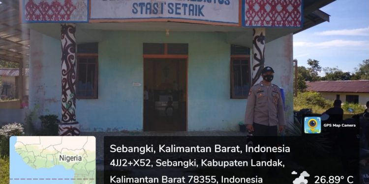 Polres Landak – Polsek Sebangki | Dalam rangka memberikan Pelayanan Rasa Aman dan nyaman bagi Jemaat yang melaksanakan Ibadah di Gereja ST. Benedictus Setasi Setaik Kecamatan Sebangki,meskipun di masa Pandemi covid 19 Anggota Polsek Sebangki Bripka Suhardianto bersama Bhabinkamtibmas Bripka Junaidi Atos melaksanakan Pengamanan Ibadah dalam rangka Antisipasi gangguan kamtibmas di Gereja dengan mematuhi Prokes ( Memakai Masker ). Minggu, (12/12/2021).